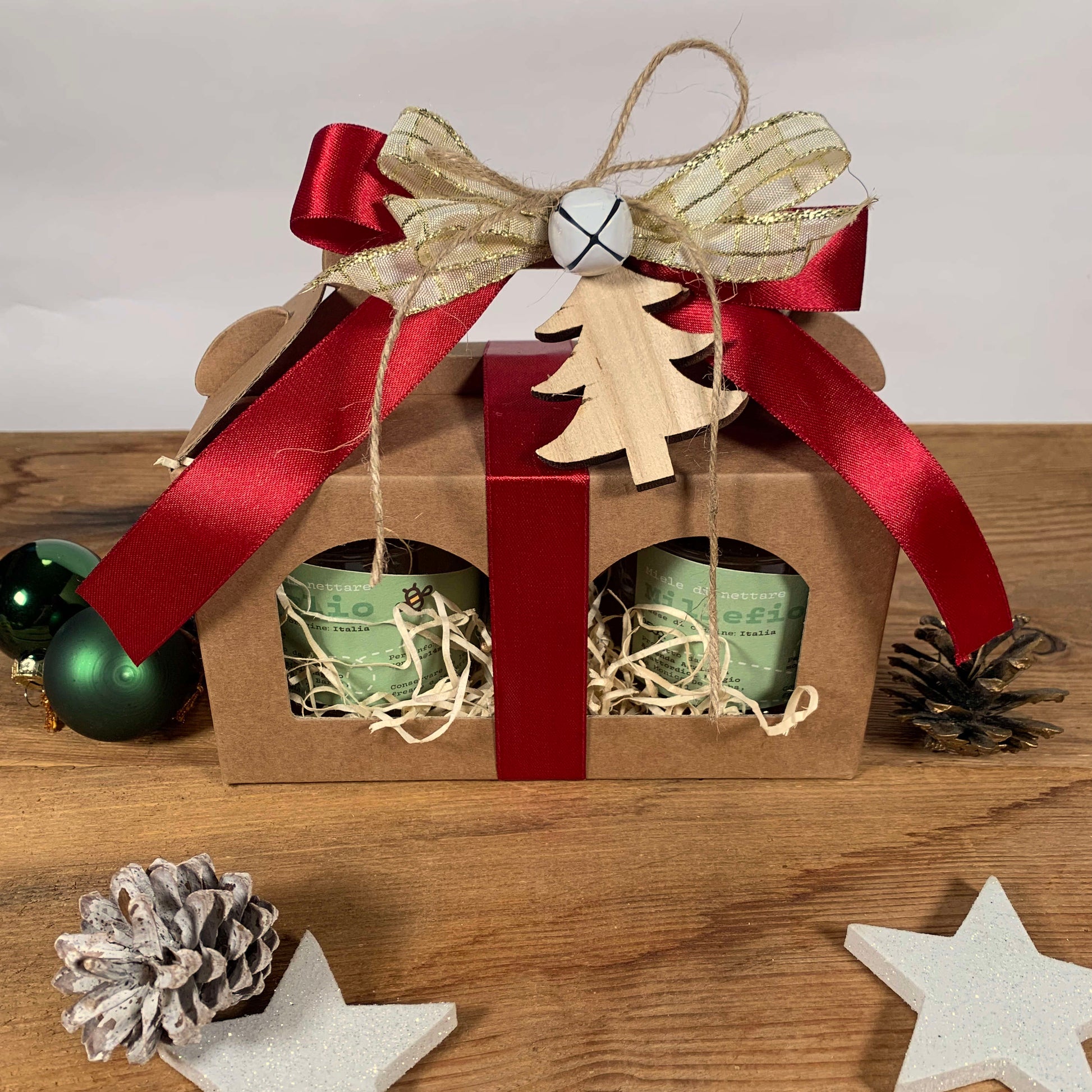 Confezione regalo due vasetti di miele artigianale da 250g e un coglimiele in legno inseriti in una scatola di cartone craft e decorata con materiali naturali e soggetti natalizi.